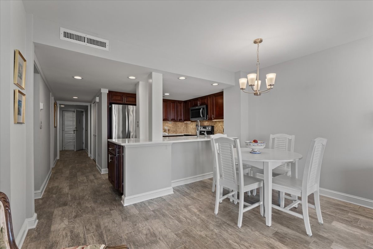 The fully-stocked kitchen has been renovated to open up the bar area and updated with all new lighting. Stainless steel appliances and cherry cabinets offer plenty of storage! Granite countertops, tiled backsplash, updated sink and faucet. Unique, beauty, dishes; and all cookware necessary for preparing meals is included. The dining table seats four. The dining area opens up to the spacious living area, with Smart TV, queen sleeper sofa and sliding glass doors to the balcony-what an absolutely stunning view!!