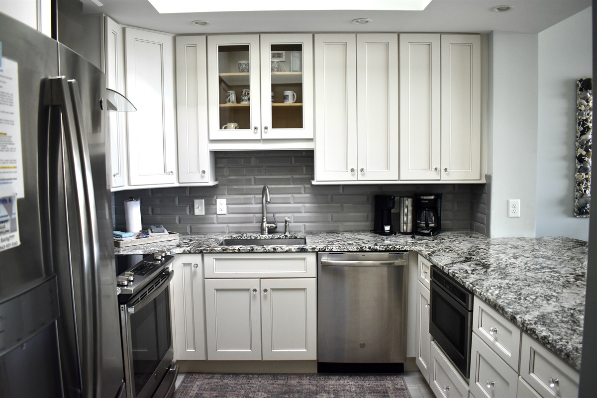 Our newly purchased home away from home has been extensively redesigned, remodeled, and redecorated. Our condo has wood look tile throughout, 10ft ceilings, and is painted in a soothing blue/gray color. Our fabulous kitchen has all new cabinetry, granite countertops, all new stainless appliances including an under the counter microwave and is fully stocked with all your cooking and dining needs. The huge ocean facing granite countertop that doubles as an island was created by moving the stove and kitchen sink to adjacent walls. We have a custom built pantry with roll out shelving in the hall as well as a wine station. The oceanfront, tiled living room and dining room are very spacious with TV and ample seating including a pull out sofa. Sliding glass doos lead to the 10' x 14' tiled balcony. The panoramic view of the ocean, beach and surrounding property is spectacular.