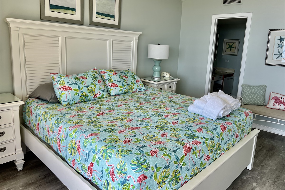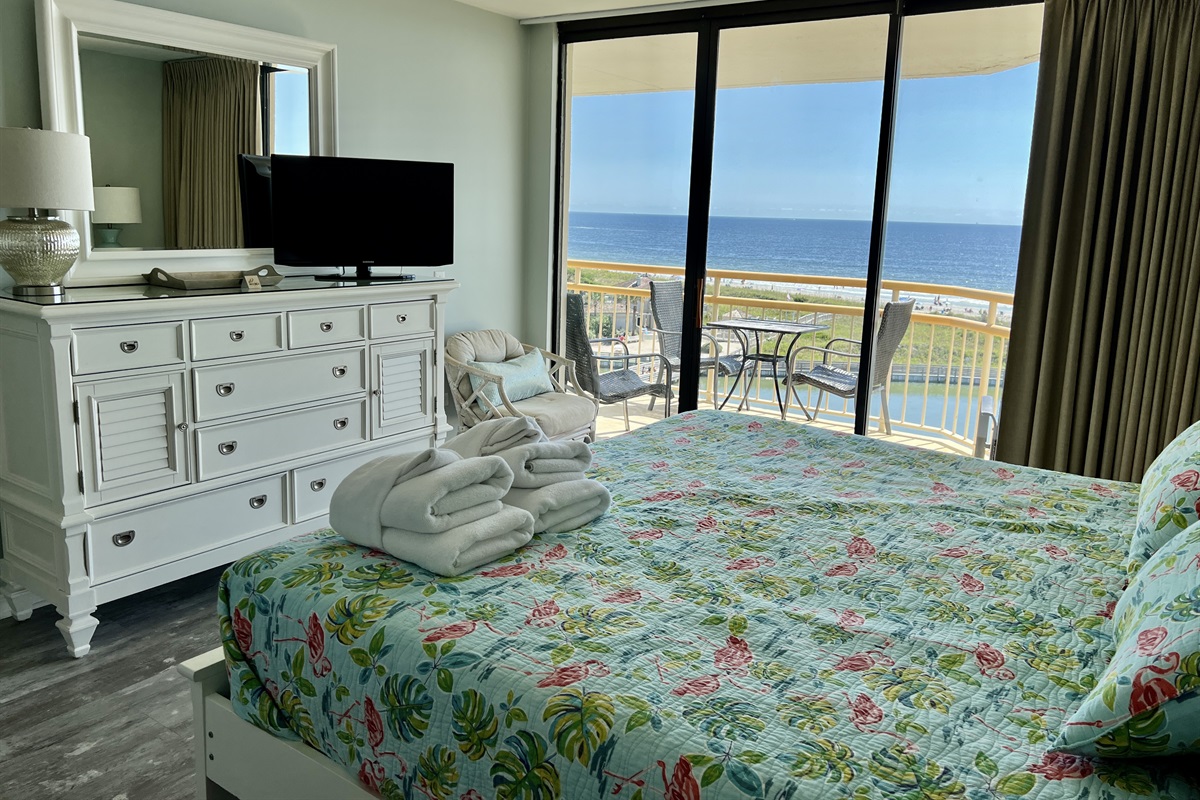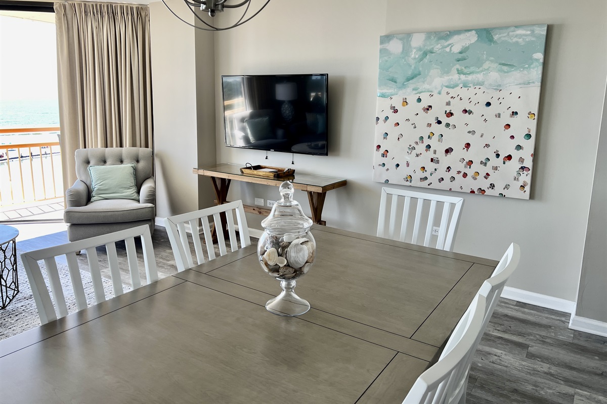 Our beautiful 3BR/2BA direct oceanfront condo is ready to be your next vacation destination! Our newly decorated condo will sleep eight. Our direct oceanfront living room has a new sleeper sofa, wall mounted TV and a gorgeous view of the ocean. Two sets of sliding glass doors for a full panoramic provide a totally unobtructed view of ocean. New Luxury Vinyl Tile in a beachy driftwood color, just added in the Living/Dining Room and Master Bedroom! 2022- New white cabinets and countertops! Kitchen is fully stocked with all your dining and cooking necessities. We have all new stainless steel appliances. The dining area will seat six at the table + two additional seats at the bar. The oceanfront master bedroom has a new king bed (2018), sliding glass doors to the balcony, TV, new LVT flooring, and adjoining full bath. Master bath has double vanity sinks, tub/shower combo and walk in closet. Guest bedroom #1 has a queen bed and TV and the second guestbed room has two twin beds and TV. Plantation shutters just installed in the two guest bedrooms and foyer. The hall bath has a vanity and shower stall. Our oceanfront balcony has a nice table with four chairs + chaise lounge. Great condo, nicely decorated, perfect for a family of six or eight. Full size washer/dryer in the hall, free Wi-Fi, and plenty of free parking. Please feel free to call or email with any questions. We look forward to having you as our guests.