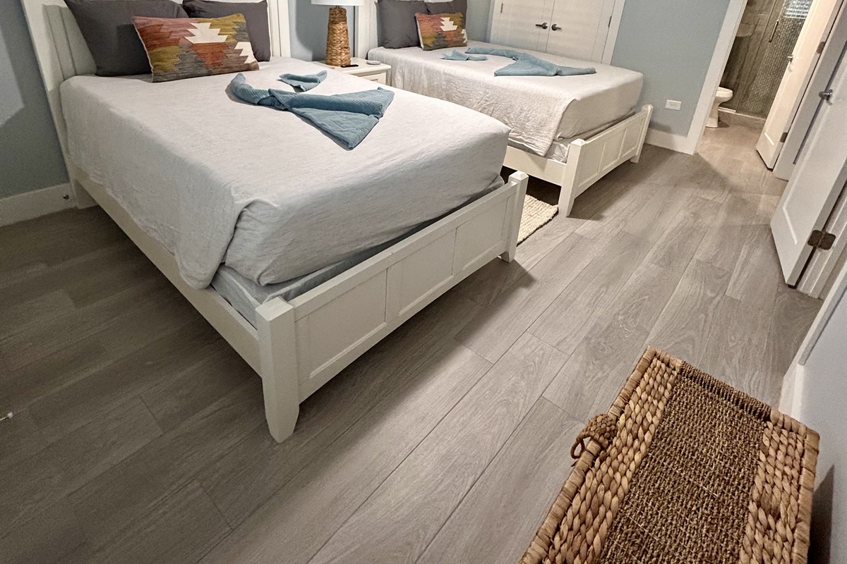 The second guest bedroom has two double beds with new bedding and new linens. We have a wall mounted Smart TV. The En Suite bath also has a new vanity, and walk in tiled shower.